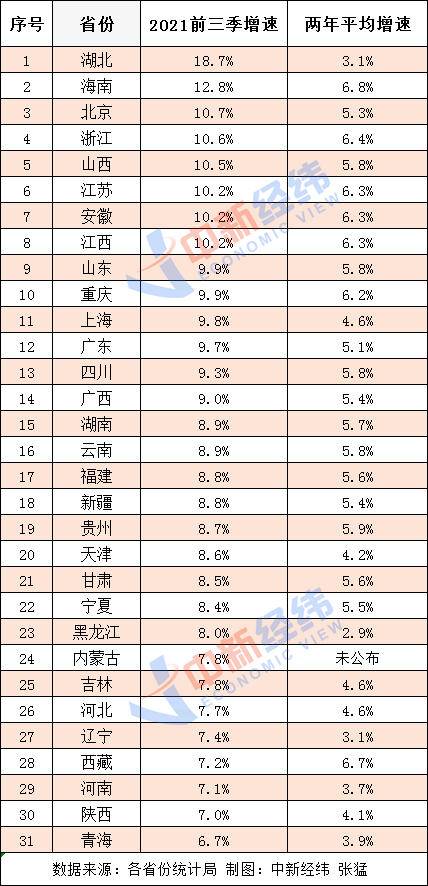 從GDP增速來看,31省份中,湖北、海南、北京、浙江、山西、江蘇、安徽、江西、山東、重慶等10省份前三季度GDP增速超過了全國增速,上海GDP增速與全國持平。