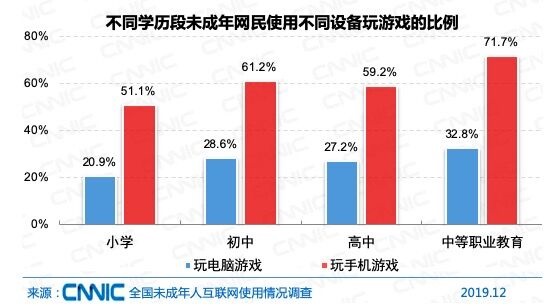 不同學(xué)歷段對比發(fā)現(xiàn),雖然小學(xué)生網(wǎng)民使用電腦和手機(jī)玩游戲的比例為各學(xué)歷段最低,但依然達(dá)到20.9%和51.9%;初中生網(wǎng)民使用電腦和手機(jī)玩游戲的比例分別為28.6%和61.2%,高中生由于學(xué)業(yè)壓力更大,玩游戲比例反而比初中生要略低一些。