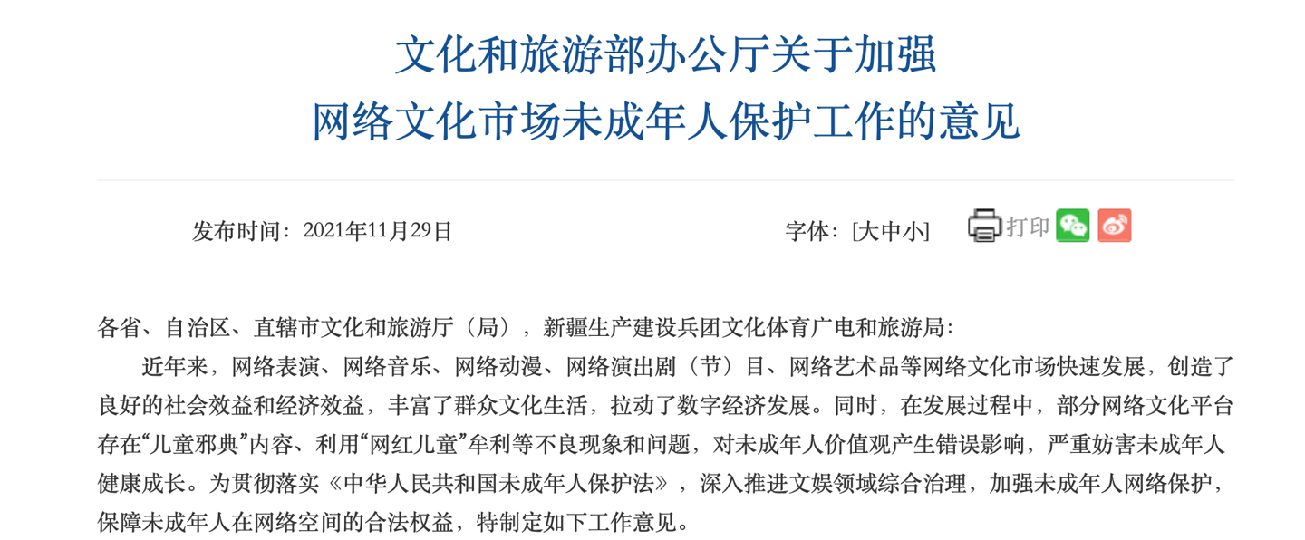 文化和旅游部辦公廳關(guān)于加強網(wǎng)絡(luò)文化市場未成年人保護工作的意見