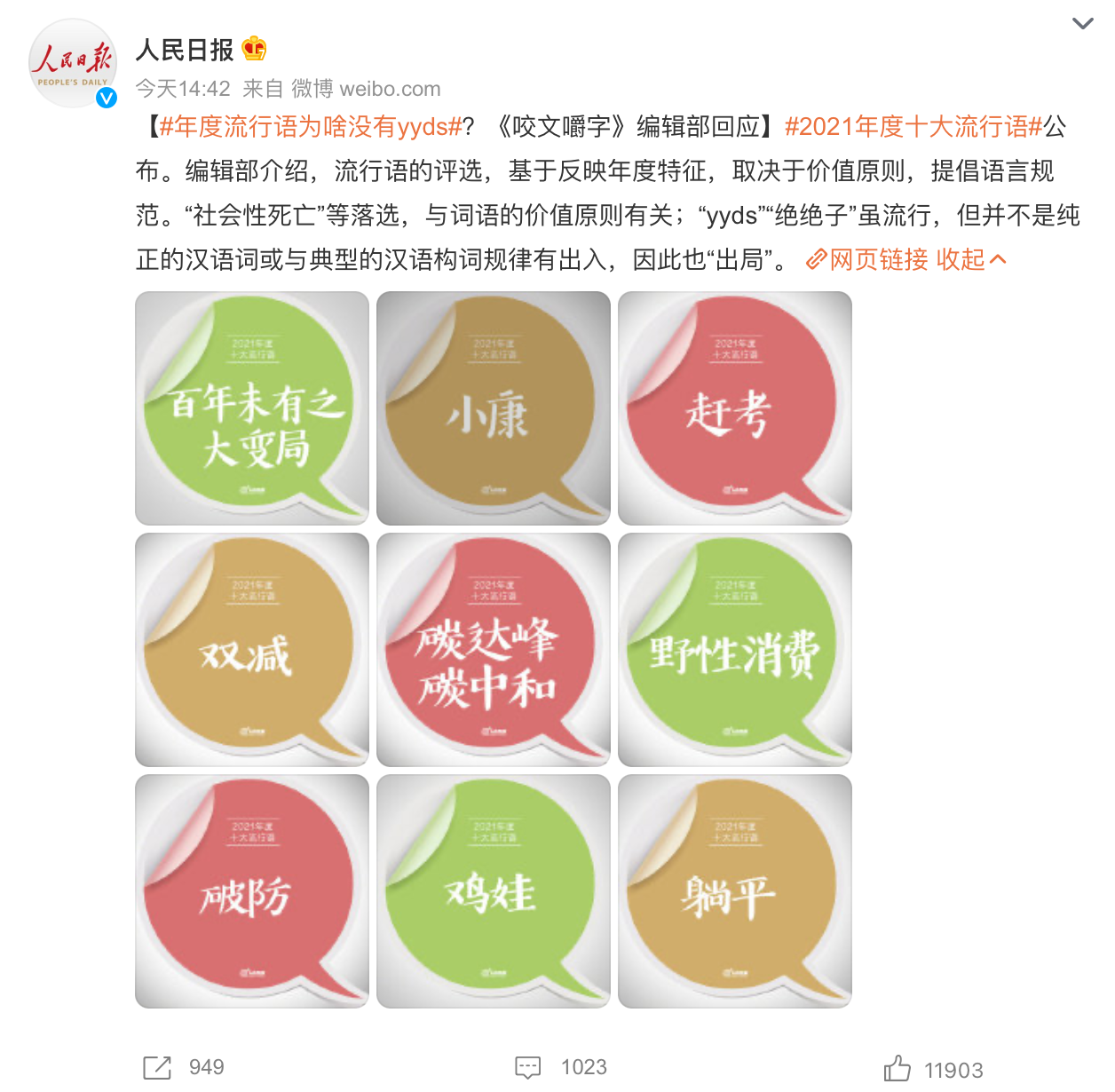 另據(jù)人民日報消息,“社會性死亡”等詞語落選是因為與詞語的價值原則有關(guān),“yyds”“絕絕子”雖流行,但并不是純正的漢語詞或與典型的漢語構(gòu)詞規(guī)律有出入。