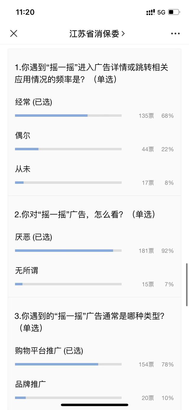 江蘇省消保委官方微信公眾號組織的投票調(diào)查顯示,有68%的消費者經(jīng)常遇到“搖一搖”開屏廣告,92%的消費者對這類廣告感到厭惡。