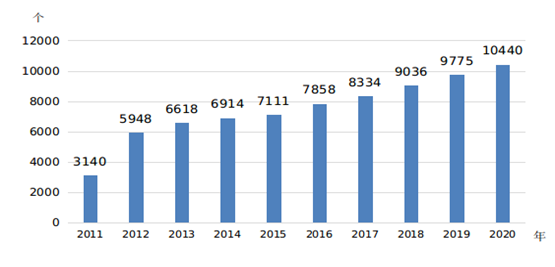 3.殘疾兒童康復(fù)服務(wù)水平顯著提升?!毒V要》實施以來,國家先后實施殘疾兒童搶救性康復(fù)項目、殘疾兒童康復(fù)救助制度,目前全國殘疾兒童康復(fù)救助政策體系、工作體系和服務(wù)網(wǎng)絡(luò)全面建立,為開展殘疾兒童康復(fù)救助提供了有力保障。截至2020年底,全國開展殘疾兒童康復(fù)的殘疾人康復(fù)機(jī)構(gòu)10440個(見圖6),比2011年增加7300個。2020年,全國共有23.7萬名0—6歲殘疾兒童接受了基本康復(fù)服務(wù),比2016年[6]增加8.7萬人,接受基本康復(fù)服務(wù)的殘疾人中0—6歲殘疾兒童比重為2.2%。