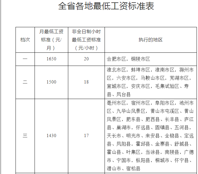 在最新最低工資標(biāo)準(zhǔn)中,合肥市區(qū)、銅陵市區(qū)是月最低工資標(biāo)準(zhǔn)1650元/月最高,非全日制小時(shí)最低工資標(biāo)準(zhǔn)20元/小時(shí)),也是最高。