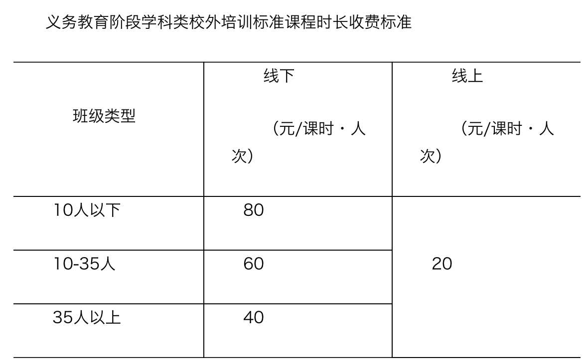 《通知》規(guī)定,10人以下、10~35人、35人以上的線下學科類校外培訓收費標準分別為80元、60和40元/課時/人,線上課程20元/人/課時。《通知》明確,培訓機構(gòu)可在上述收費標準基礎(chǔ)上,在上浮不超過10%、下浮不限的范圍內(nèi)。本通知自本市中小學2022年春季學期開學(2022年2月17日)起施行。
