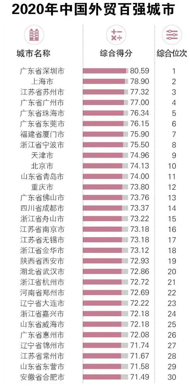 可以說,先進(jìn)制造業(yè)的發(fā)展,決定了工業(yè)大省發(fā)展的未來。誰能在戰(zhàn)略性新興產(chǎn)業(yè)里搶得先機(jī),誰就能在未來的發(fā)展中占據(jù)優(yōu)勢(shì)。06廣東,第一外貿(mào)大省。2021年,廣東外貿(mào)進(jìn)出口總額突破8萬億元,超過全國(39.1萬億元)的1/5,連續(xù)35年位居全國第一。作為“世界制造工廠”,廣東一直都是傳統(tǒng)外貿(mào)大省,其中以智能手機(jī)、家用電器、液晶顯示等為代表的機(jī)電產(chǎn)品占了出口的半壁江山。在2021年中國海關(guān)發(fā)布的外貿(mào)百強(qiáng)城市榜單中,TOP10城市里廣東占了4席,包括深圳、廣州、東莞、珠海。
