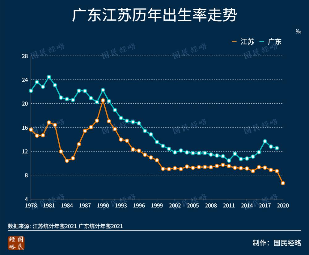 與國際對(duì)比,廣東常住人口規(guī)模已經(jīng)追平日本。日本由于“少子化+老齡化”的困擾,總?cè)丝谝呀?jīng)連續(xù)12年減少,總?cè)丝谝呀?jīng)萎縮到1.26億人左右。正如凱風(fēng)君新書《》的分析,廣東人口之多,一方面得益于高出全國平均水平的出生率,自然增長(zhǎng)人口遠(yuǎn)高于長(zhǎng)三角;另一方面得益于外來人口源源不斷涌入,人口吸引力全國最強(qiáng)。廣東人口出生率一直全國前列,遠(yuǎn)高于長(zhǎng)三角地區(qū)。最新公布的人口統(tǒng)計(jì)數(shù)據(jù)顯示,2021年全國出生人口1062萬人,出生率7.52‰,創(chuàng)下歷史新低。(參閱《逼近千萬大關(guān)!人口大變局即將降臨》)各省份2021年生育數(shù)據(jù)尚未公布。但從2020年數(shù)據(jù)來看,多數(shù)省份都出現(xiàn)明顯下滑,江蘇人口出生率僅為6.66‰,相比上年下降2.03個(gè)千分點(diǎn),連續(xù)21年低于1%(即10‰)的水平。