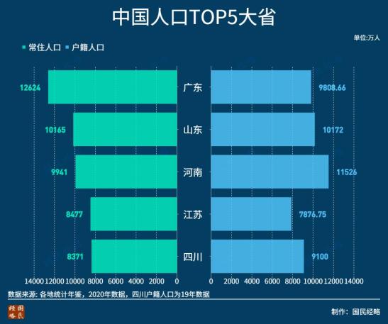 其中,廣州深圳在2010年前后就已邁入萬億俱樂部,佛山則是2019年突圍,東莞在2021年晉級(jí),也是當(dāng)年唯一晉級(jí)的萬億城市。(參閱《官宣!又一個(gè)萬億GDP城市誕生》)眾所周知,廣東之強(qiáng),強(qiáng)在珠三角。而在珠三角,廣深是龍頭,佛莞是省級(jí)經(jīng)濟(jì)中心城市,其他地市經(jīng)濟(jì)總量都不高,離萬億大關(guān)都還有相當(dāng)長(zhǎng)的距離。在東莞之后,惠州、珠海、汕頭、湛江等地市GDP不到5000億,想要突破萬億,可能需要5-8年時(shí)間。面向未來,惠州表示2026年GDP突破8000億元,珠海則表示力爭(zhēng)五年GDP超6000億元,2035年突破2萬億。就全國來看,未來5年,將會(huì)有一批城市沖刺萬億俱樂部,包括江蘇常州、徐州,山東煙臺(tái),遼寧大連,河北唐山等。03廣東還是全國人口第一大省。2020年底,廣東常住人口高達(dá)1.26億人,比第二名的山東省多了2400多萬,相當(dāng)于多了一個(gè)上海的人口規(guī)模。當(dāng)然,若論戶籍,第一人口大省當(dāng)屬河南。不過,河南由于大量勞動(dòng)力到外務(wù)工,常住人口比戶籍人口少了1600萬人。(參閱《這些超級(jí)人口大省,也生不動(dòng)了》)