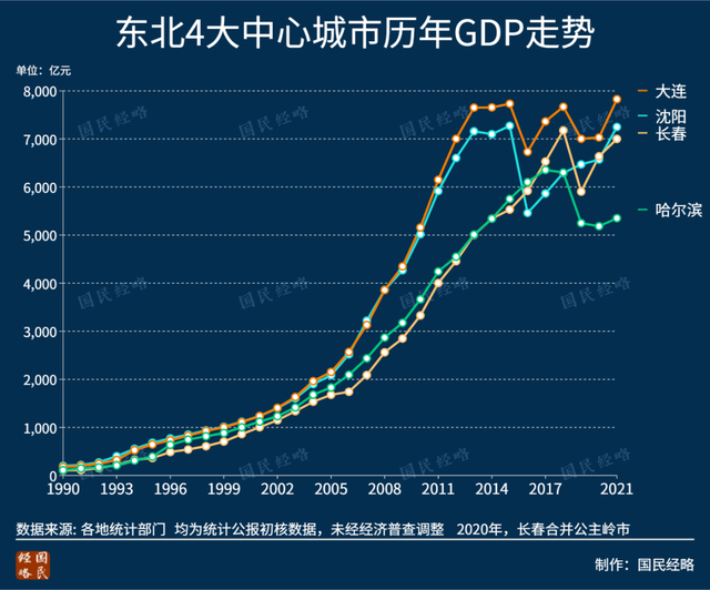 不過,近年來,東北經(jīng)濟(jì)強(qiáng)市被其他省會(huì)陸續(xù)趕超。加上前幾年經(jīng)濟(jì)普查,原本已經(jīng)突破7000億的多個(gè)東北地市,GDP遭遇擠水分,又回到了重新攀上7000億的歷程。