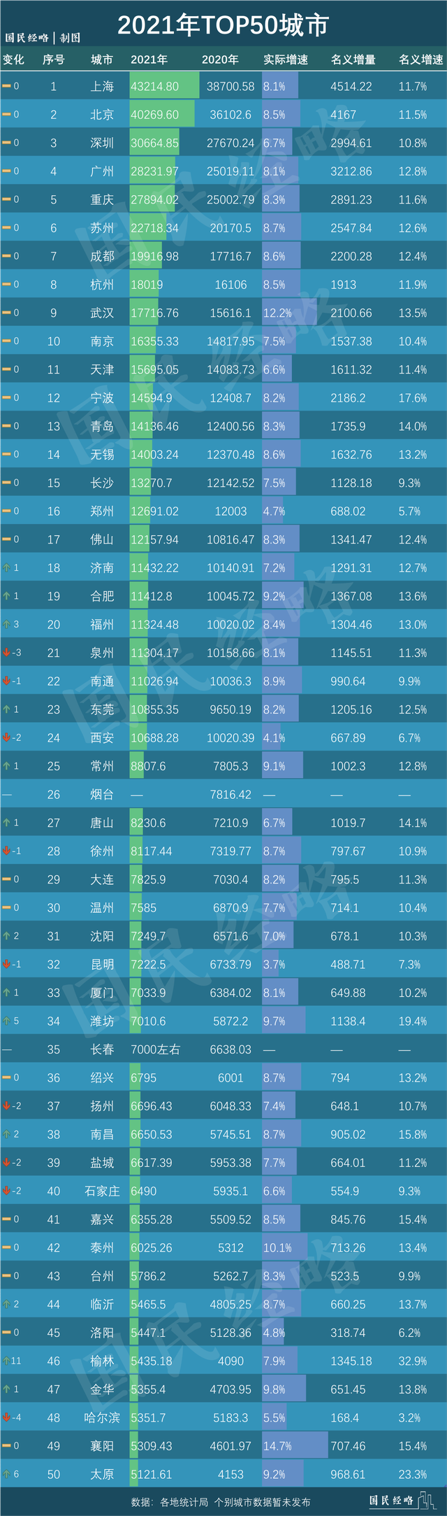 這是2021年內(nèi)地GDP50強(qiáng)城市排行榜: