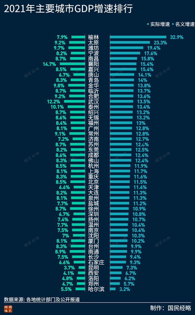 2021年,榆林、太原GDP名義增速分別高達(dá)32.9%、23.3%,城市排名分別躍升11位、6位,兩城更是得以晉級(jí)50強(qiáng)之列。