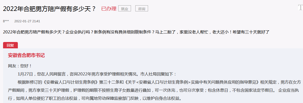 2022-02-15 11:53:08閱讀()合肥市人社局近日,有網(wǎng)友在人民網(wǎng)留言問,2022年合肥男方陪產(chǎn)假有多少天?企業(yè)會執(zhí)行嗎?