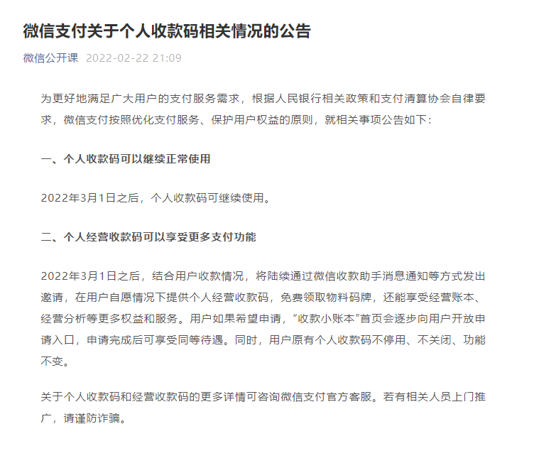 2022年3月1日之后,個(gè)人收款碼可繼續(xù)使用。