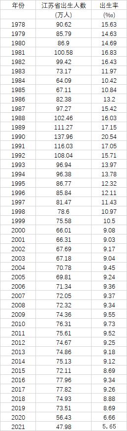 表:1978年以來江蘇歷年出生人口數(shù)據(jù)(數(shù)據(jù)來源:第一財經(jīng)記者根據(jù)《江蘇統(tǒng)計年鑒2021》、2021年江蘇省國民經(jīng)濟(jì)和社會發(fā)展統(tǒng)計公報整理)