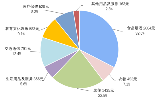 一季度,全國(guó)居民人均食品煙酒消費(fèi)支出2084元,增長(zhǎng)4.9%,占人均消費(fèi)支出的比重為32.6%;人均衣著消費(fèi)支出453元,增長(zhǎng)3.6%,占人均消費(fèi)支出的比重為7.1%;人均居住消費(fèi)支出1435元,增長(zhǎng)6.7%,占人均消費(fèi)支出的比重為22.5%;人均生活用品及服務(wù)消費(fèi)支出356元,增長(zhǎng)4.8%,占人均消費(fèi)支出的比重為5.6%;人均交通通信消費(fèi)支出791元,增長(zhǎng)12.7%,占人均消費(fèi)支出的比重為12.4%;人均教育文化娛樂(lè)消費(fèi)支出583元,增長(zhǎng)6.9%,占人均消費(fèi)支出的比重為9.1%;人均醫(yī)療保健消費(fèi)支出528元,增長(zhǎng)9.1%,占人均消費(fèi)支出的比重為8.3%;人均其他用品及服務(wù)消費(fèi)支出163元,增長(zhǎng)17.1%,占人均消費(fèi)支出的比重為2.5%。