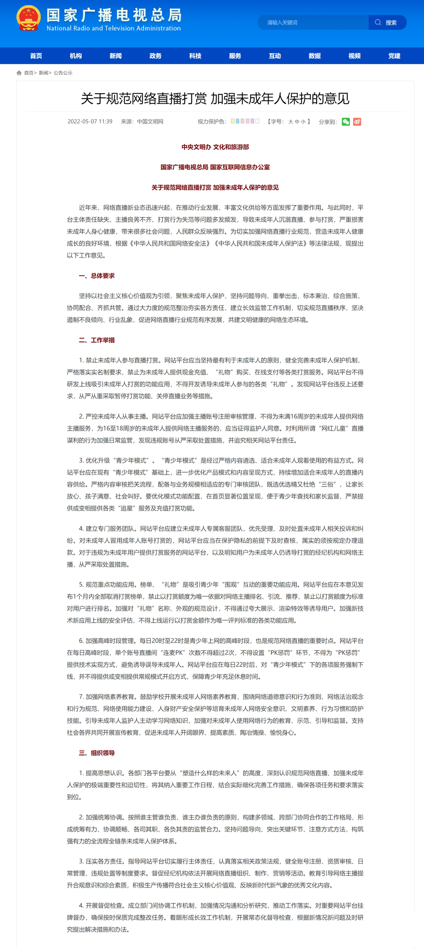 2022-05-07 23:39:22閱讀()國家廣電總局5月7日消息,據(jù)國家廣播電視總局網(wǎng)站,中央文明辦、文化和旅游部、國家廣播電視總局、國家互聯(lián)網(wǎng)信息辦公室發(fā)布了《關(guān)于規(guī)范網(wǎng)絡(luò)直播打賞加強(qiáng)未成年人保護(hù)的意見》(以下簡稱《意見》)。