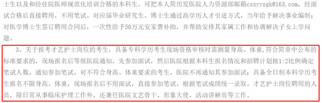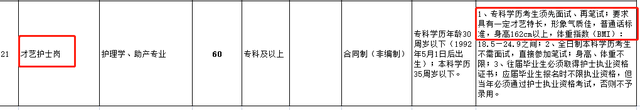 值得注意的是,該崗位在“其他條件”中要求:“??茖W(xué)歷考生須先面試、再筆試;要求具有一定才藝特長,形象氣質(zhì)佳,普通話標(biāo)準(zhǔn),身高162cm以上,體重指數(shù)(BMI):18.5—24.9之間”,但“全日制本科學(xué)歷考生不需面試,直接參加筆試;身高、體重不限”;往屆生須具有護(hù)士執(zhí)業(yè)資格證書(或成績合格證),應(yīng)屆生暫時不限執(zhí)業(yè)證書,但當(dāng)年必須參加護(hù)士執(zhí)業(yè)資格考試并成績合格,否則不予錄用。”
