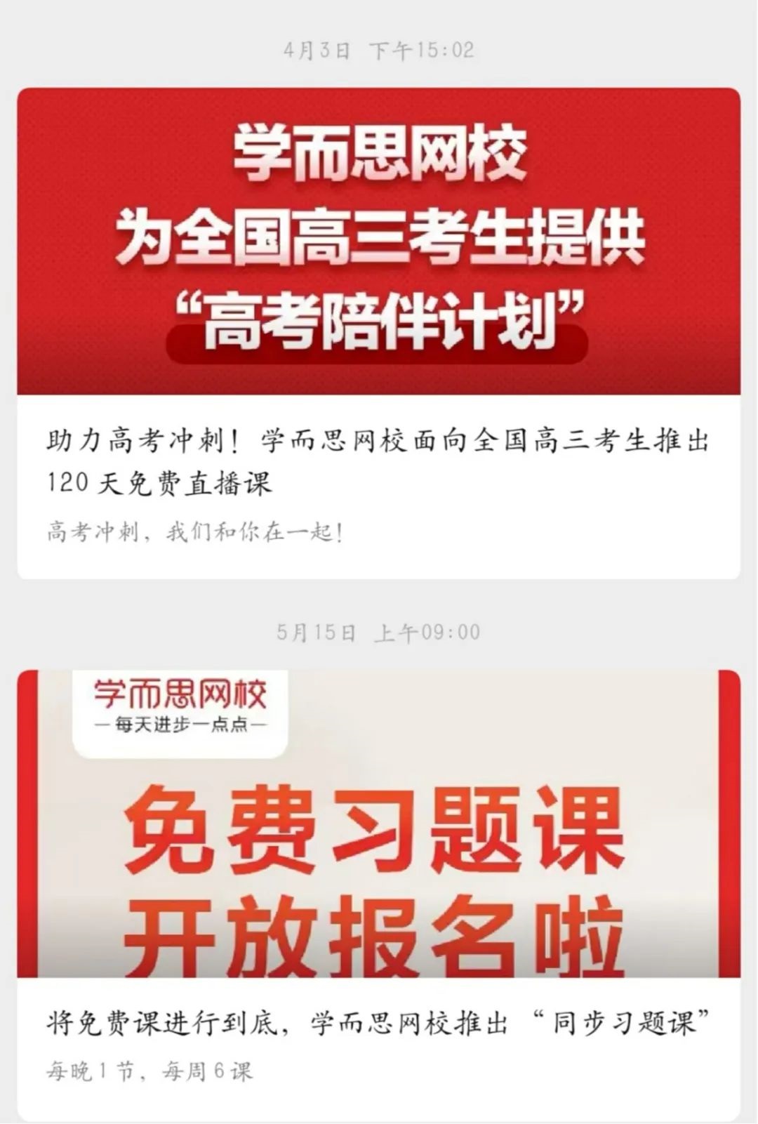 記者注意到,學(xué)而思網(wǎng)校在 4 月 3 日通過官方微信宣布面向高三學(xué)生推出 120 天免費(fèi)直播課。緊接著,5 月 15 日又再次宣布 “將免費(fèi)課進(jìn)行到底”,每周一到周六每天晚上開設(shè) 40 分鐘的同步習(xí)題課,覆蓋小學(xué)一年級到初中三年級。