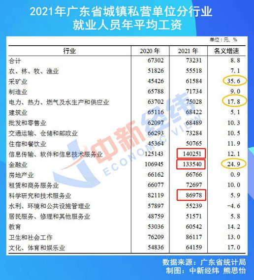 以廣東省為例,分行業(yè)門類看,年平均工資最高的分別是信息傳輸、軟件和信息技術(shù)服務(wù)業(yè)140251元,金融業(yè)133540元,科學(xué)研究和技術(shù)服務(wù)業(yè)86978元;從增長(zhǎng)速度看,年平均工資增速最高的三個(gè)行業(yè)門類依次為采礦業(yè),金融業(yè)和電力、熱力、燃?xì)饧八a(chǎn)和供應(yīng)業(yè),分別增長(zhǎng)35.6%、24.9%和17.8%。