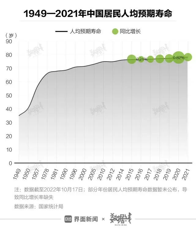國家統(tǒng)計局數(shù)據(jù)顯示,新中國成立初期我國人均預期壽命僅為35歲,而在2021年,我國人均預期壽命已上漲43.2歲至78.2歲,漲幅達123.43%。界面數(shù)據(jù)統(tǒng)計發(fā)現(xiàn),2015年-2021年,我國人均預期壽命逐年增長,但增幅較小且值呈波動趨勢,均在1%以下。