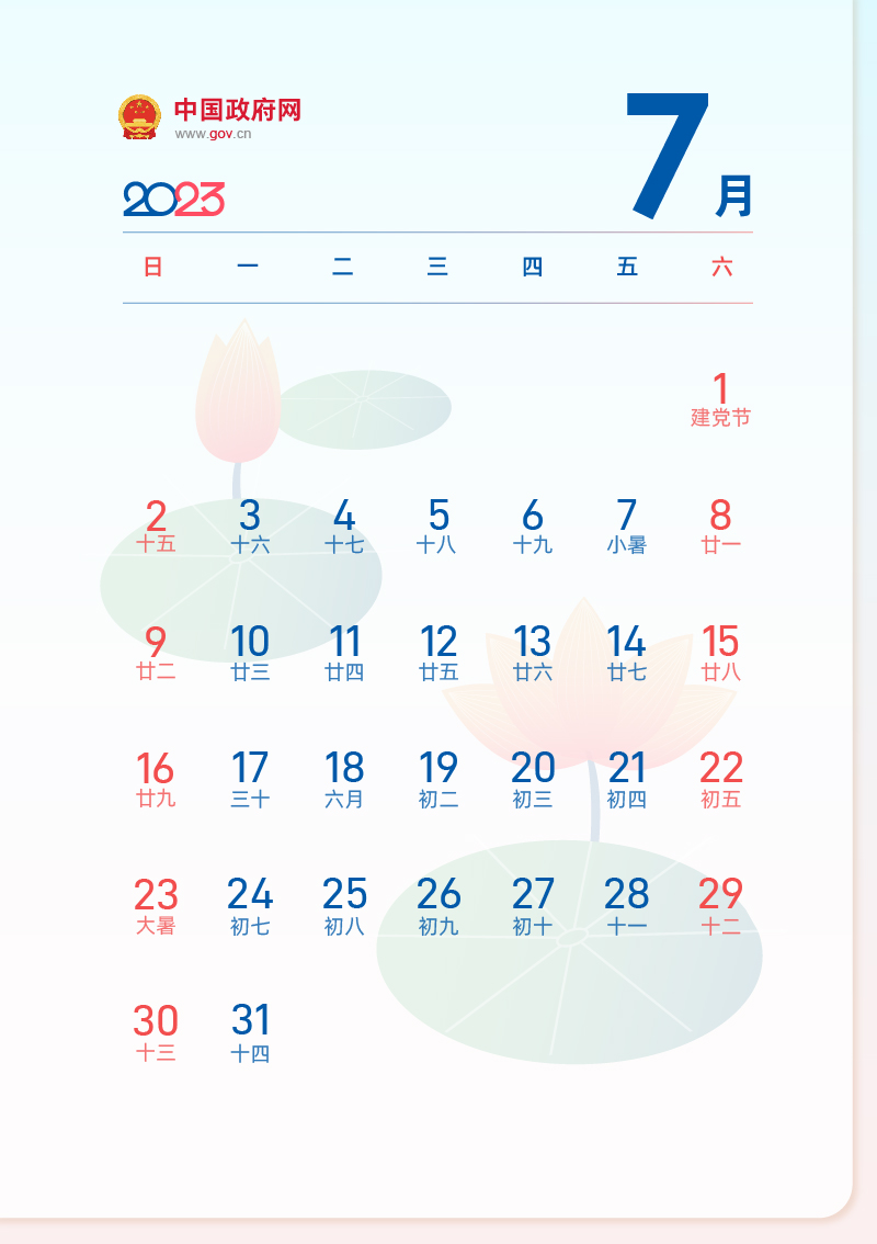 經(jīng)國務院批準,現(xiàn)將2023年元旦、春節(jié)、清明節(jié)、勞動節(jié)、端午節(jié)、中秋節(jié)和國慶節(jié)放假調(diào)休日期的具體安排通知如下。