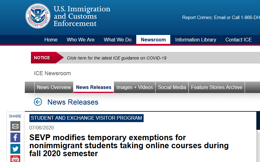 本月6日,ICE出臺新規(guī)稱,如果所在大學2020年秋季學期采取全面網(wǎng)上授課,這些學校的所有國際學生將不會獲得赴美簽證,已在美國境內(nèi)者需離境。