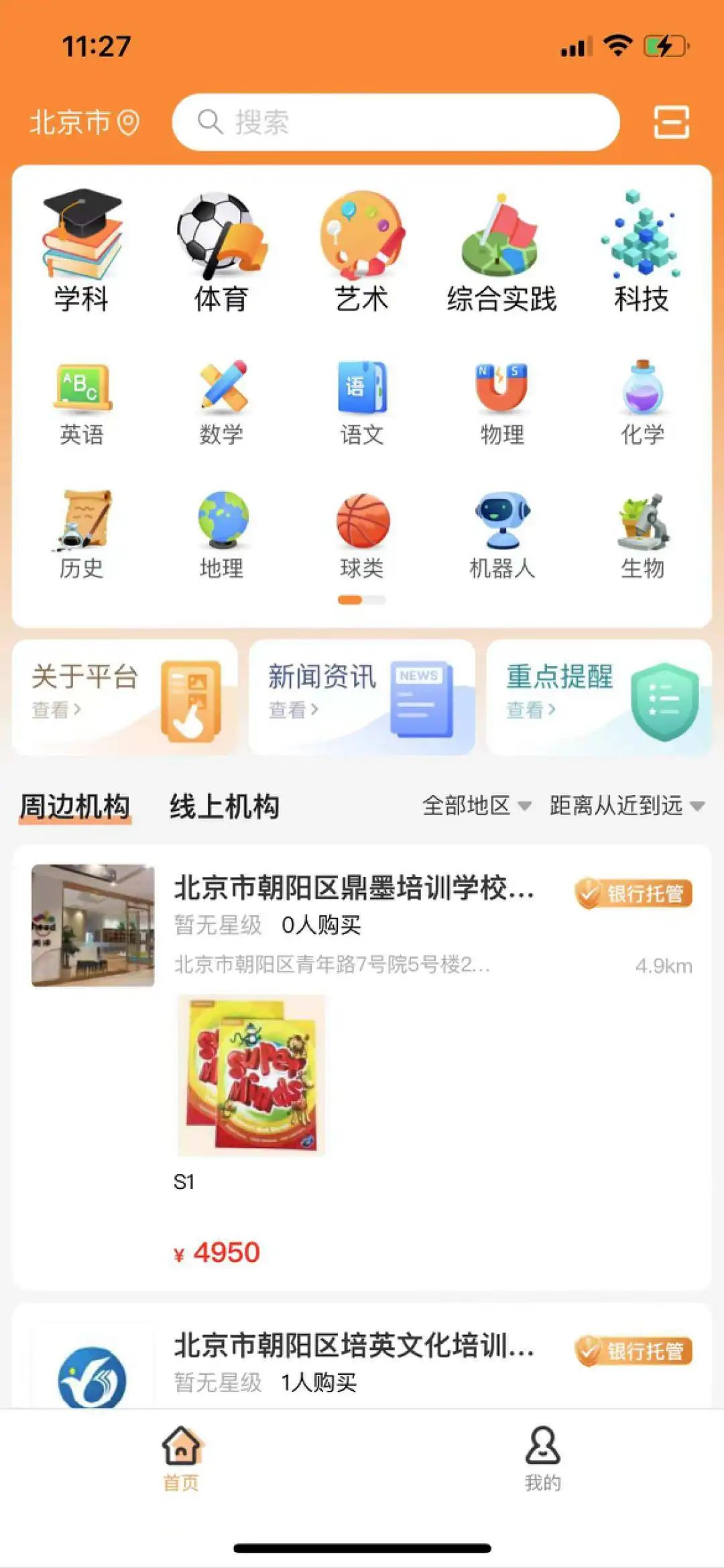 在“校外培訓(xùn)家長(zhǎng)端”App首頁(yè),有學(xué)科、體育、藝術(shù)、綜合實(shí)踐、科技、英語(yǔ)、數(shù)學(xué)、語(yǔ)文、物理、化學(xué)、歷史、地理等所有校外學(xué)科,集中了當(dāng)?shù)氐木€下教育培訓(xùn)機(jī)構(gòu)。