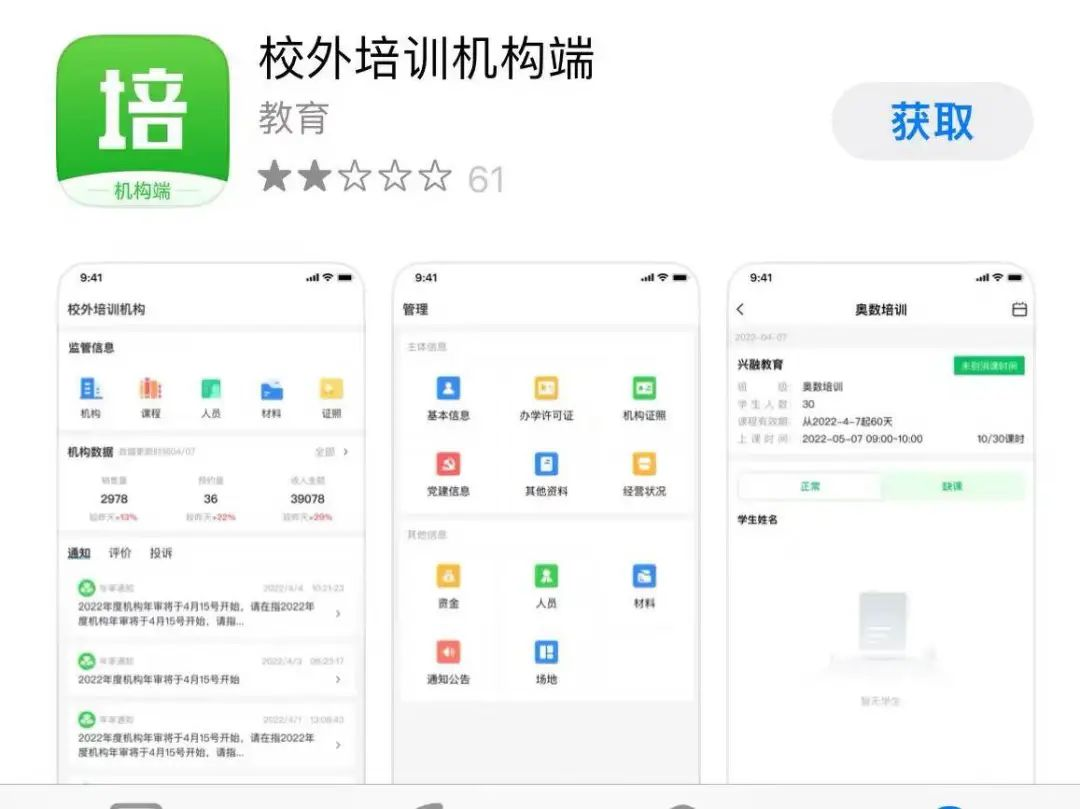而針對(duì)線下教育培訓(xùn)機(jī)構(gòu),教育部旗下中央電化教育館還推出了“校外培訓(xùn)機(jī)構(gòu)端”App,支撐落實(shí)備案審批制度。同時(shí),還推出了“校外培訓(xùn)管理端”App,形成教育培訓(xùn)監(jiān)管與服務(wù)的App矩陣。