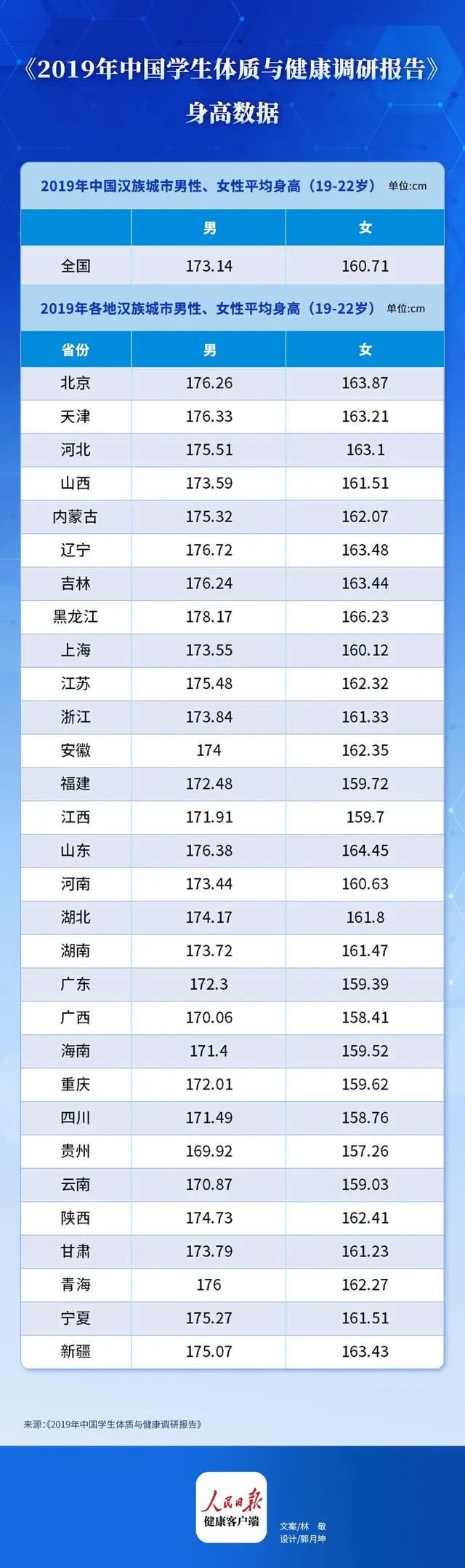 那么山東人的身高在全國中處于什么水平呢?人民日報健康客戶端查詢,根據高等教育出版社出版的《2019年中國學生體質調研報告》,19-22歲我國城市男生平均身高173.99厘米,城市女生是161.41厘米。