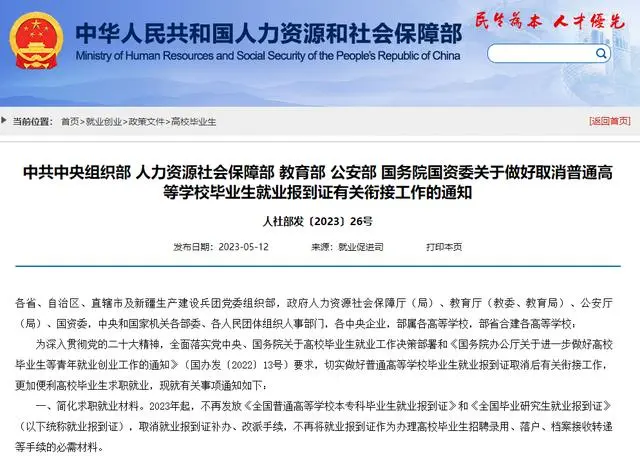 2023-05-13 09:47:19閱讀()人民政協(xié)網(wǎng)據(jù)人社部網(wǎng)站消息,日前中共中央組織部、人力資源社會(huì)保障部、教育部、公安部、國(guó)務(wù)院國(guó)資委發(fā)布《關(guān)于做好取消普通高等學(xué)校畢業(yè)生就業(yè)報(bào)到證有關(guān)銜接工作的通知》(以下簡(jiǎn)稱(chēng)《通知》)?!锻ㄖ访鞔_,2023年起,不再發(fā)放《全國(guó)普通高等學(xué)校本專(zhuān)科畢業(yè)生就業(yè)報(bào)到證》和《全國(guó)畢業(yè)研究生就業(yè)報(bào)到證》(以下統(tǒng)稱(chēng)“就業(yè)報(bào)到證”),取消就業(yè)報(bào)到證補(bǔ)辦、改派手續(xù),不再將就業(yè)報(bào)到證作為辦理高校畢業(yè)生招聘錄用、落戶(hù)、檔案接收轉(zhuǎn)遞等手續(xù)的必需材料。