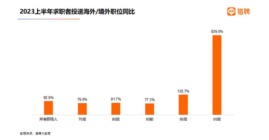 從2023上半年不同代際求職者投遞海外/境外職位的同比增長(zhǎng)情況看,70后、80后、95前同比去年同期增幅均在80%左右,95后同比增長(zhǎng)135.7%,00后同比激增539.0%。不過(guò)需要注意的是,單從人才投遞占比看,相較出海/出境,投遞國(guó)內(nèi)職位的求職者占據(jù)絕對(duì)比例。而00后相比其他代際在投遞海外/境外職位的占比中最小,但其同比增速快。