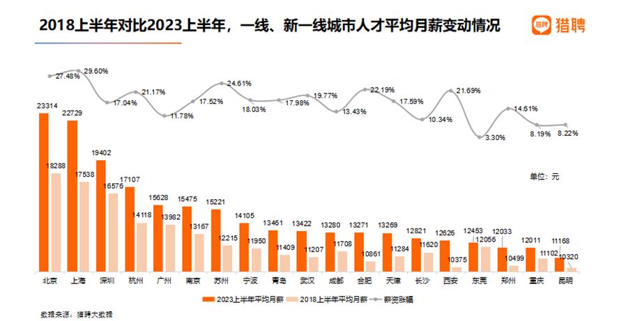 2023-07-25 17:55:34閱讀()中新經(jīng)緯7月25日電 日前,同道獵聘旗下獵聘發(fā)布《2023上半年人才流動(dòng)與薪酬趨勢(shì)報(bào)告》,報(bào)告顯示,從2023年上半年趨勢(shì)來(lái)看,越來(lái)越多的年輕人正涌向新一線城市。2023年人才投遞熱門城市前三分別為上海、北京和深圳。薪資方面,北京平均月薪18976元全國(guó)最高,而上海近六年來(lái)薪資漲幅最高,達(dá)29.6%。