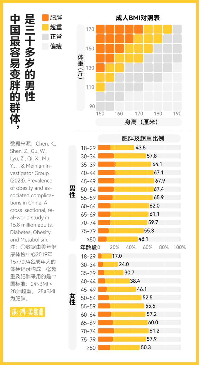 根據(jù)中國人的體質(zhì),成年人的 BMI 指數(shù)(體重(千克)/【身高(米)的平方】)分別達(dá)到 24 和 28 時,就是超重和肥胖?;谶@一標(biāo)準(zhǔn),近期發(fā)表于學(xué)術(shù)期刊《糖尿病、肥胖與代謝》上的一篇名為《中國肥胖患病率及相關(guān)并發(fā)癥:1580 萬成年人的橫斷面真實世界研究》論文,就統(tǒng)計出了中國的整體發(fā)胖情況:有 34.8% 的人超重,另外還有 14.1% 的人有更嚴(yán)重的肥胖問題。