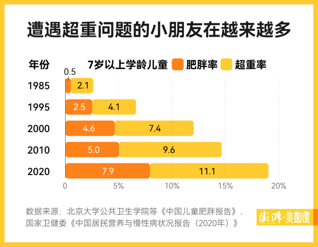 因此除了成年人,兒童的肥胖情況也同樣不容忽視。根據(jù)國家衛(wèi)健委在 2020 年發(fā)布最新一期《中國居民營養(yǎng)與慢性病狀況報告》,與 1985 年時,中國 7 歲以上學(xué)齡兒童超重和肥胖率僅 2.6% 比,現(xiàn)在的小朋友遭遇體重問題的比例也已經(jīng)上升到了 19.0%。