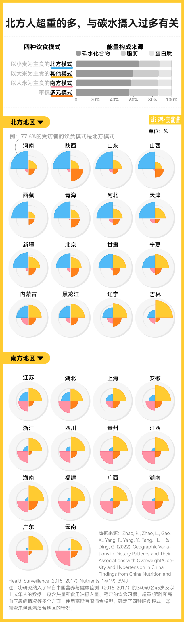 其中,北方膳食模式相對其他模式,有更多的能量是來自碳水化合物(超過 60%),研究認(rèn)為這可能就導(dǎo)致了北方地區(qū)的超重和肥胖風(fēng)險更高。