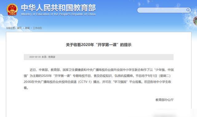 近日,中宣部、教育部、國家衛(wèi)健委、中央廣播電視總臺,以“少年強,中國強”為主題的2020年全國“開學第一課”專題電視節(jié)目,普及防疫知識、弘揚抗疫精神。節(jié)目將于9月1日20:00在中央廣播電視總臺CCTV-1綜合頻道播出。