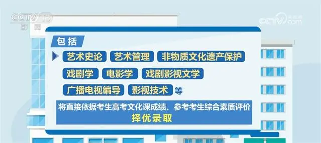 據(jù)了解,藝術(shù)類專業(yè)依據(jù)考生高考文化成績(jī)、專業(yè)考試成績(jī),參考綜合素質(zhì)評(píng)價(jià)進(jìn)行招生錄取。此次藝考改革一個(gè)重要的變化是,部分藝術(shù)類專業(yè)不再組織專業(yè)考試,包括藝術(shù)史論、藝術(shù)管理、非物質(zhì)文化遺產(chǎn)保護(hù)、戲劇學(xué)、電影學(xué)、戲劇影視文學(xué)、廣播電視編導(dǎo)、影視技術(shù)等,將直接依據(jù)考生高考文化課成績(jī)、參考考生綜合素質(zhì)評(píng)價(jià),擇優(yōu)錄取。