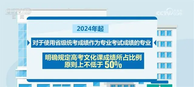 此外,2024年起,對(duì)于使用省級(jí)統(tǒng)考成績(jī)作為專業(yè)考試成績(jī)的專業(yè),明確規(guī)定高考文化課成績(jī)所占比例原則上不低于50%。同時(shí),鼓勵(lì)??几咝=Y(jié)合專業(yè)培養(yǎng)要求,進(jìn)一步提高考生高考文化課成績(jī)錄取要求。