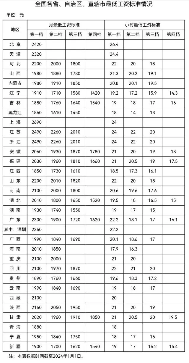 2024-01-22 16:12:05閱讀()人社部近日,人社部官網(wǎng)發(fā)布了全國各省、自治區(qū)、直轄市最低工資標(biāo)準(zhǔn)情況(截至2024年1月1日)。從月最低工資標(biāo)準(zhǔn)來看,上海以2690元位居全國首位。從小時最低工資標(biāo)準(zhǔn)來看,北京以26.4元排名第一。2024年以來,江蘇、浙江、遼寧等多個省份宣布上調(diào)最低工資標(biāo)準(zhǔn),其中,遼寧將從2024年5月1日起上調(diào)最低工資標(biāo)準(zhǔn)。
