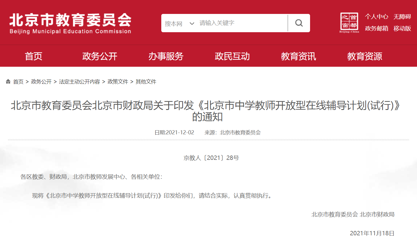 12月3日消息,北京市教育委員會(huì)12月2日公布北京市教育委員會(huì)、北京市財(cái)政局關(guān)于印發(fā)《北京市中學(xué)教師開(kāi)放型在線輔導(dǎo)計(jì)劃(試行)》(下稱《計(jì) ...