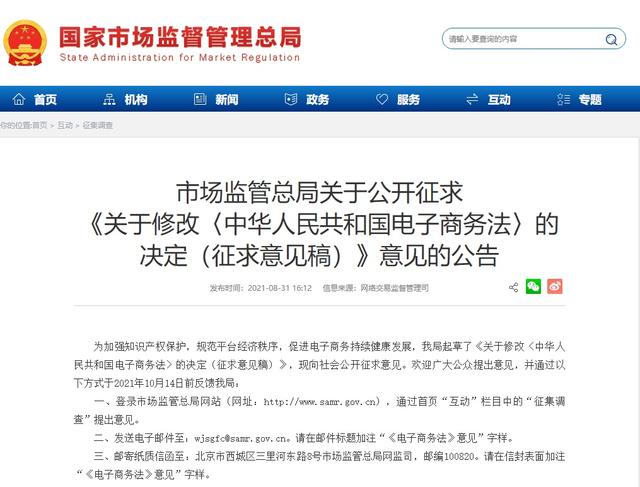 8月31日,市場監(jiān)管總局發(fā)布公告,針對《關(guān)于修改〈中華人民共和國電子商務(wù)法〉的決定(征求意見稿)》向社會公開征求意見。市場監(jiān)管總局表示 ...