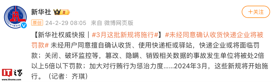 據(jù)新華社官方微博報(bào)道,快遞不得擅放驛站、企業(yè)個(gè)人不得拒收電子發(fā)票等一批新規(guī)自3月1日起施行。主要內(nèi)容如下:快遞不得擅自放快遞柜修訂后 ...