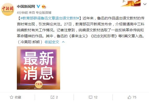 今天,教育部召開新聞發(fā)布會,介紹了普通高中三科統(tǒng)編教材有關(guān)工作情況。魯迅的作品退出語文教材的傳言引發(fā)了輿論關(guān)注,而教育部對此進行了 ...