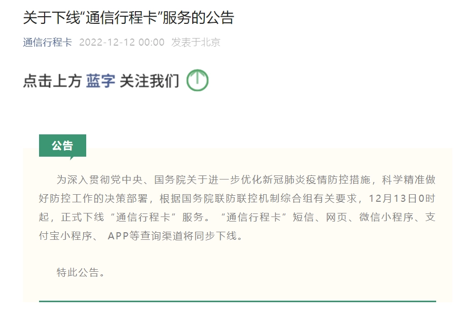12月13日0時(shí)起,通信行程卡服務(wù)正式下線