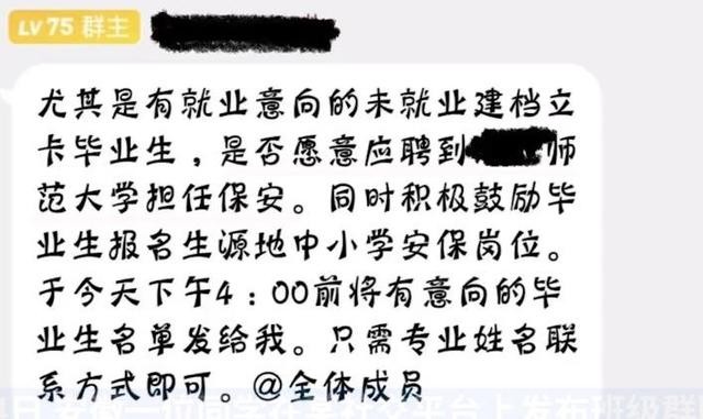 6月24日,安徽一位同學發(fā)布班級群聊截圖,照片顯示該校招本校學生當本校保安,當天16時截止報名,并鼓勵學生應聘生源地中小學安保崗位。據 ...