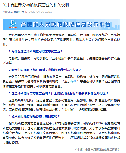 據(jù)合肥市人民政府發(fā)布微信號(hào)消息,合肥市第36次市疫防工作視頻會(huì)商會(huì)強(qiáng)調(diào),電影院、健身房、網(wǎng)吧及部分“五小場所”事關(guān)就業(yè)生計(jì),可在符合 ...