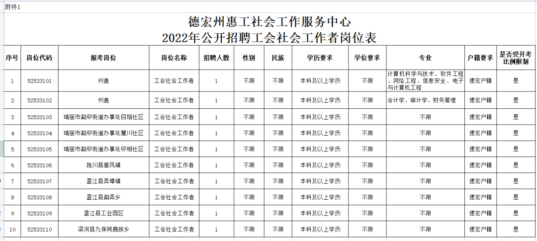 面向社會(huì)公開招聘合同制工會(huì)社會(huì)工作者10名。具體崗位、條件、要求等詳見《德宏州惠工社會(huì)工作服務(wù)中心2022年公開招聘工會(huì)社會(huì)工作者崗位表》(附件1)。