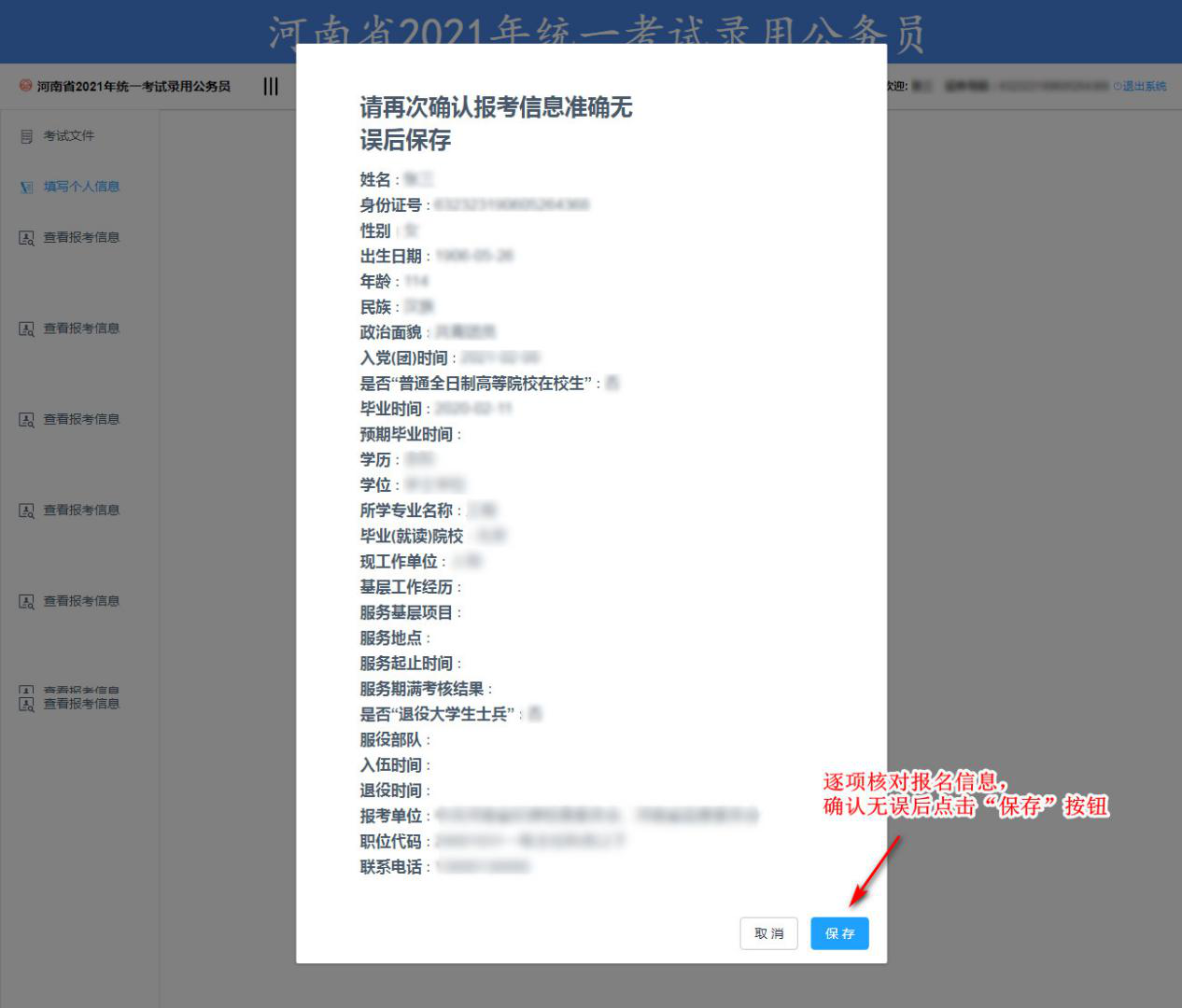 逐項(xiàng)核對(duì)報(bào)名信息,確認(rèn)無誤后點(diǎn)擊“保存”按鈕,彈出如下頁(yè)面,至此保存成功。