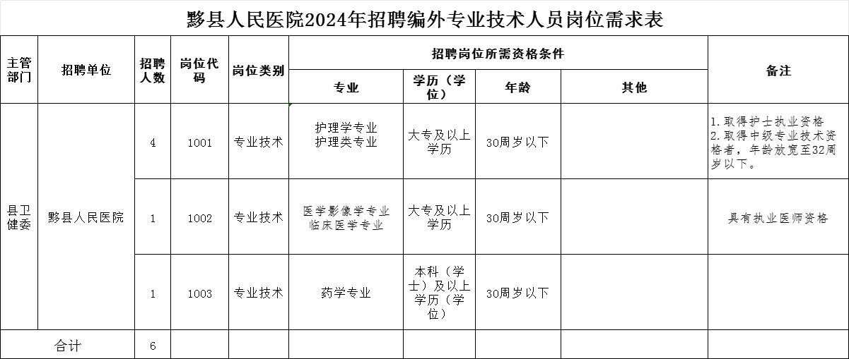 本次招聘共計(jì)3個(gè)崗位6名專業(yè)技術(shù)人員。詳見《黟縣人民醫(yī)院2024年招聘編外專業(yè)技術(shù)人員崗位需求表》