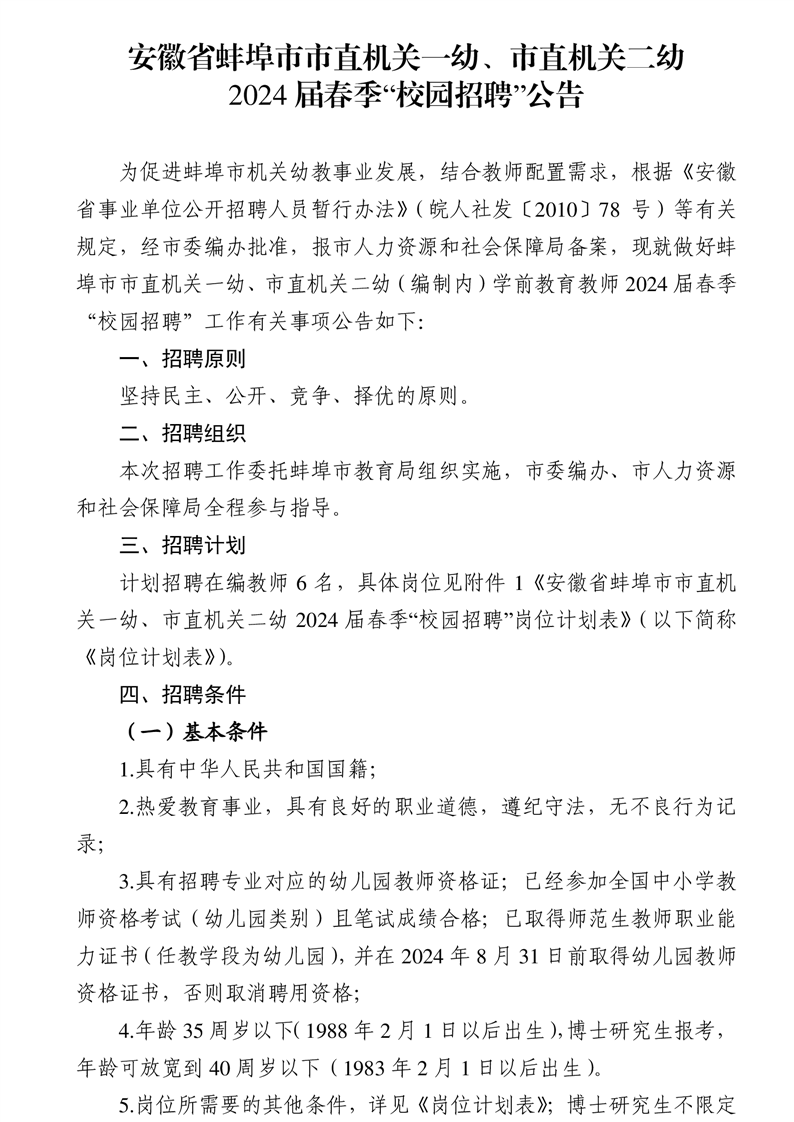 2024年蚌埠市市直機(jī)關(guān)一幼、市直機(jī)關(guān)二幼2024屆春季“校園招聘”公告