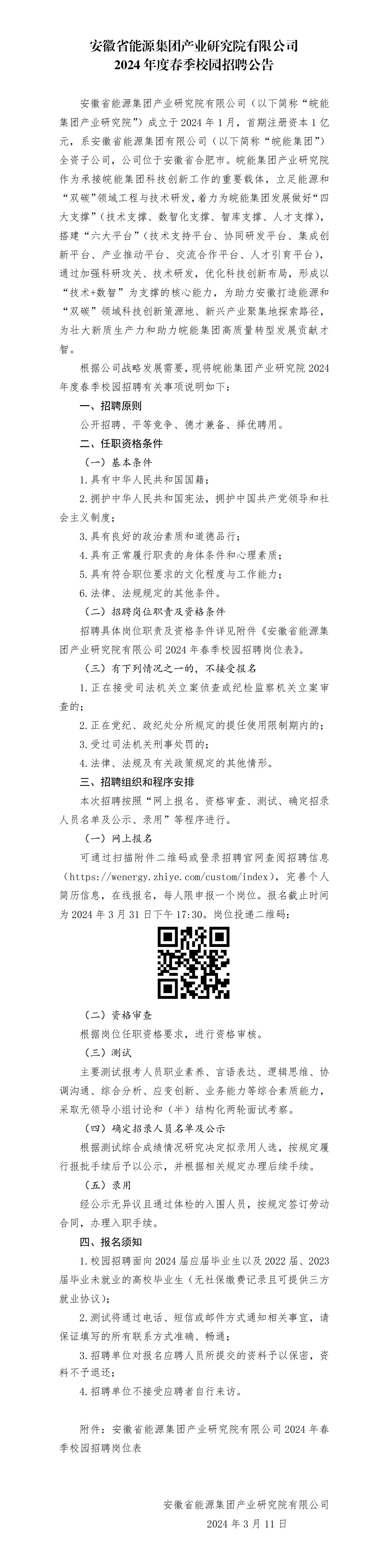 2024年安徽省能源集團(tuán)產(chǎn)業(yè)研究院有限公司春季校園招聘公告